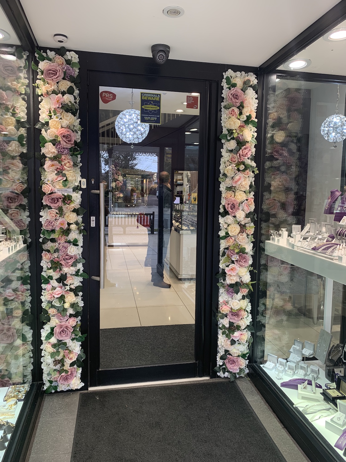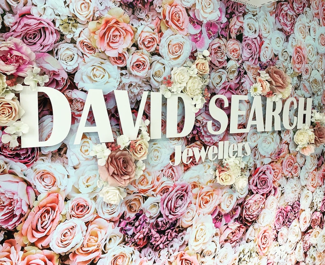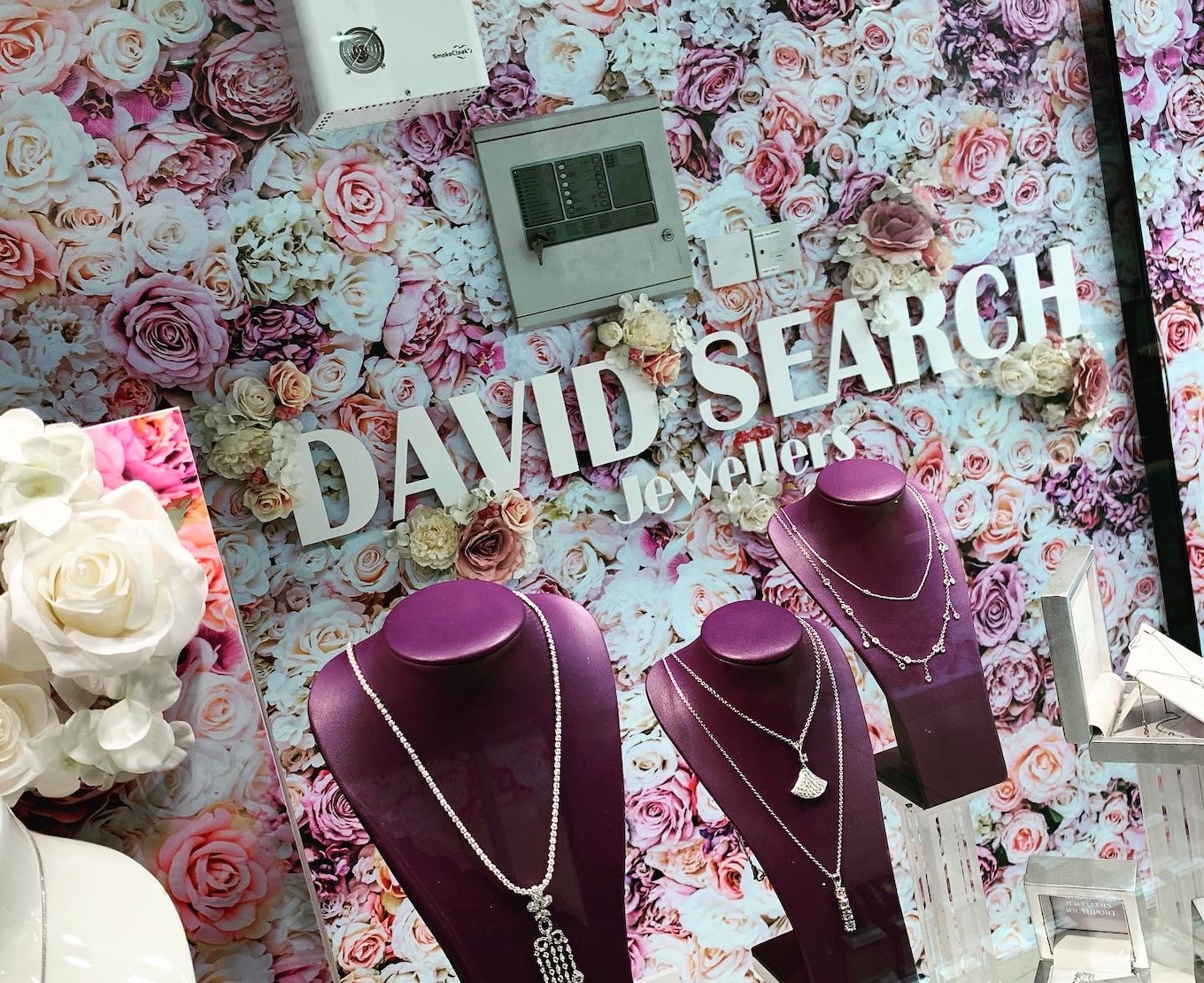 A pretty printed vinyl with cream, pink and lilac roses is applied to the walls in the jewellery and watch windows. Cut “David Search” logo letters are added with artificial silk flowers, giving a 3D effect.